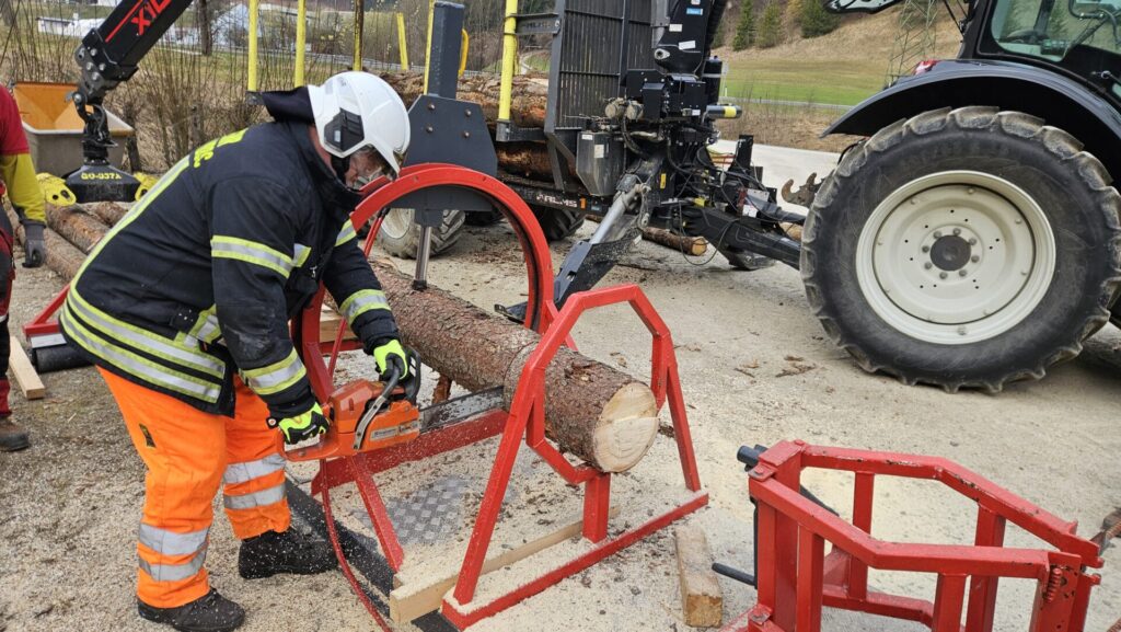 Am Holzverspannungssimulator konnten die Teilnehmerinnen und Teilnehmer realistische Einsatzszenarien beüben. Mit diesem Gerät lassen sich verschiedene Situationen rund um eingeklemmte oder verschobene Holzstämme nachstellen – wie sie bei Sturm- oder Forstunfällen häufig auftreten.