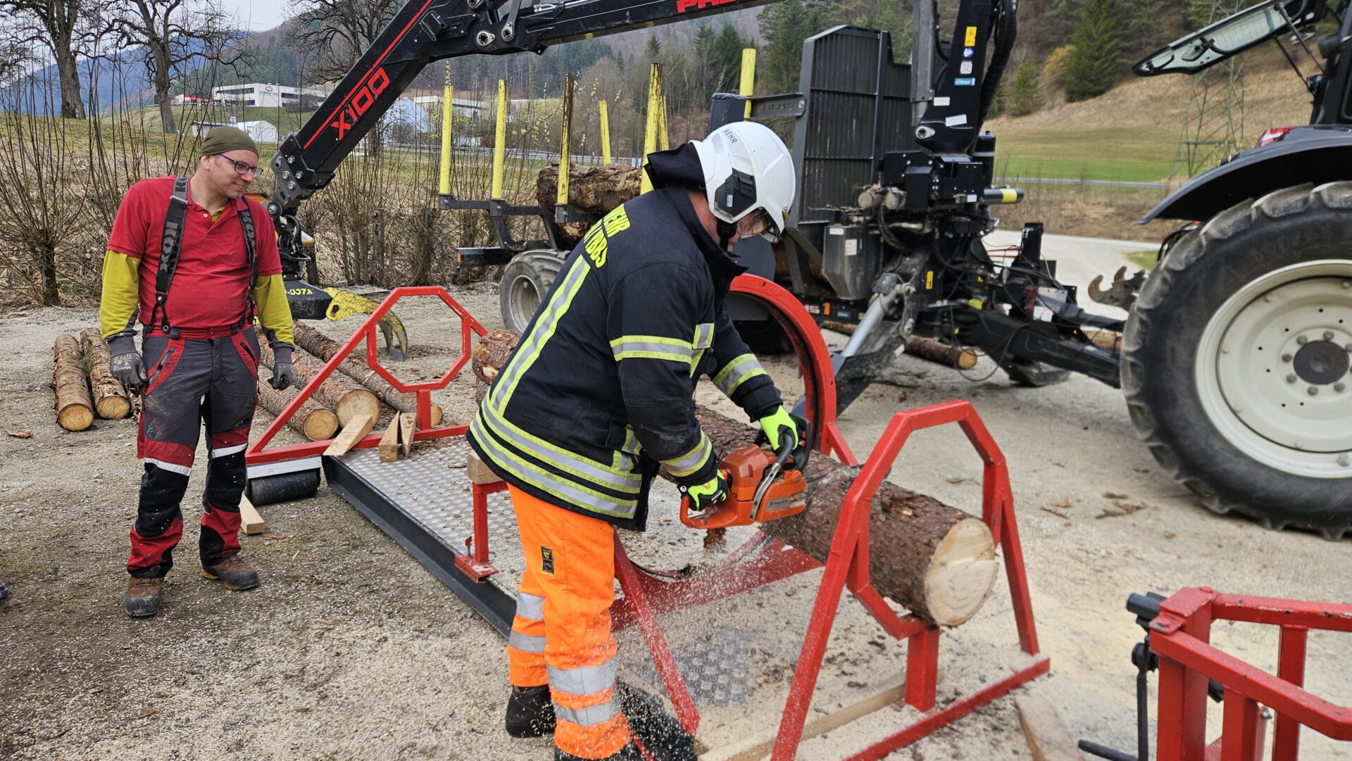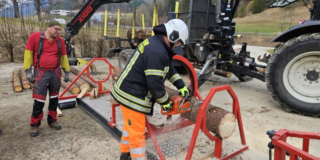 Am Holzverspannungssimulator konnten die Teilnehmerinnen und Teilnehmer realistische Einsatzszenarien beüben. Mit diesem Gerät lassen sich verschiedene Situationen rund um eingeklemmte oder verschobene Holzstämme nachstellen – wie sie bei Sturm- oder Forstunfällen häufig auftreten.